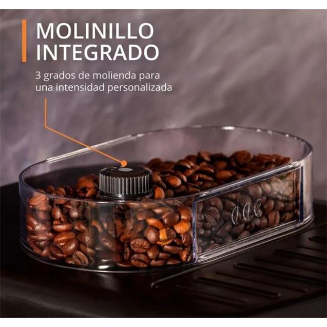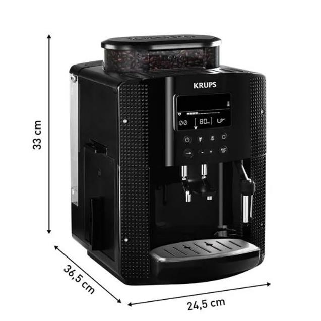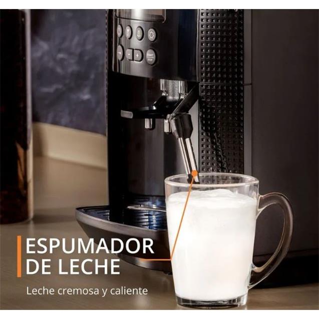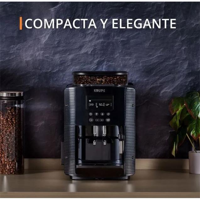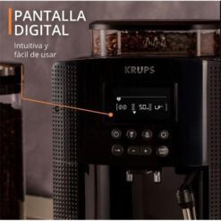 La cafetera Krups EA815070 es una máquina espresso superautomática que permite preparar café de calidad profesional en casa con solo presionar un botón. Cuenta con un molinillo cónico integrado con capacidad para 260 gramos de granos, una bomba de 15 bares de presión y un sistema Thermoblock que asegura una temperatura ideal desde la primera taza. Su depósito de agua extraíble tiene una capacidad de 1,7 litros, facilitando el uso diario. Incorpora una pantalla LCD con botones táctiles que permite seleccionar diferentes intensidades de café, guardar bebidas favoritas y controlar todas sus funciones de forma intuitiva. Además, incluye una lanza de vapor para espumar leche y preparar capuccinos o lattes, y un sistema automático de enjuague y descalcificación para mantener la máquina siempre en óptimas condiciones. Con diseño compacto, elegante y fácil de limpiar, es ideal para quienes buscan una experiencia completa de café desde el grano hasta la taza, sin complicaciones.