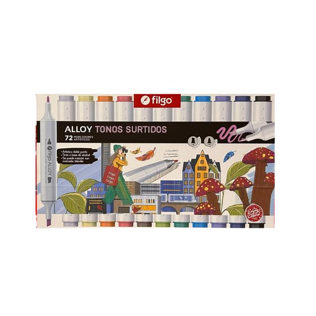 El Estuche de Marcadores Filgo Alloy 5798 permanentes doble punta x72 unidades es ideal para ilustración, diseño, lettering y trabajos creativos de mayor detalle. Incluye una amplia variedad de tonos surtidos, con tinta permanente de secado rápido y doble punta, que permite realizar trazos finos y rellenos amplios con gran precisión. Su presentación en estuche rígido facilita el orden y transporte, convirtiéndolo en una excelente opción para artistas, estudiantes y creativos que buscan versatilidad y una mayor gama de colores en un solo set.