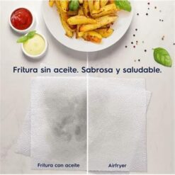REDUCÍ TUS RESIDUOS DE ACEITE: Más sustentable, disminuye los resíduos de aceite hasta 24 lts al año². ²considerando el consumo de 24 paquetes de 500 g de papas fritas/año. Es necesario usar 1 L de aceite para freír 500 g de forma convencional, pero usando la Airfryer, solo 25 ml.