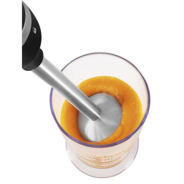 Incluye un vaso medidor de 500ml y un práctico accesorio batidor. Su diseño robusto y cuchillas de acero inoxidable garantizan resultados perfectos y limpieza rápida. Ideal para batidos, salsas y más.