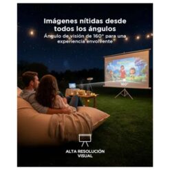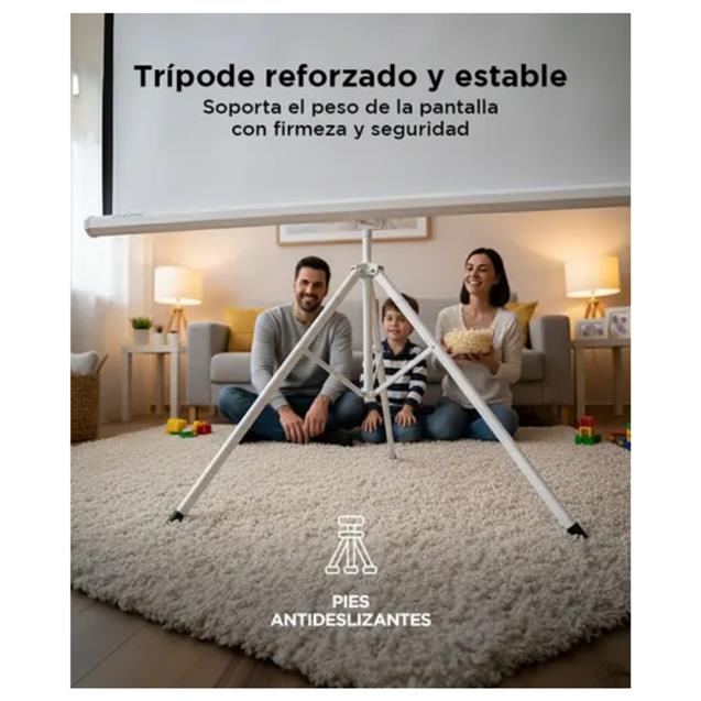 Montaje sencillo y transportabilidad. Incluye tripode de alta estabilidad que facilita su instalación en diferentes ambientes. Con un peso de unos siete coma cinco kilogramos y dimensiones visibles de aproximadamente dos metros de ancho por uno cincuenta de alto, es versátil tanto para el hogar como para eventos o clases.