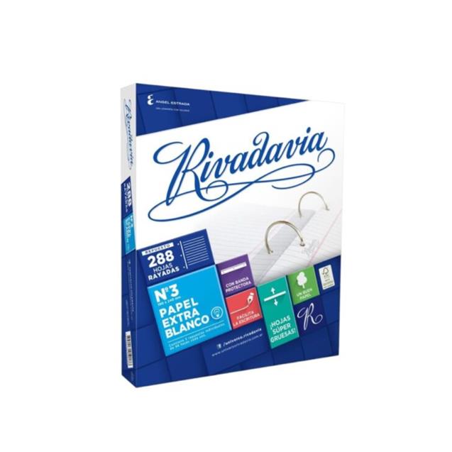El Repuesto Rivadavia Nº3 rayado x288 hojas está fabricado con papel extra blanco de alta calidad, ideal para escritura diaria, estudio y uso escolar o universitario. Sus hojas gruesas permiten una escritura más prolija y cómoda, evitando el traspaso de tinta. Cuenta con perforado para carpeta y banda protectora, lo que facilita su organización y durabilidad.
