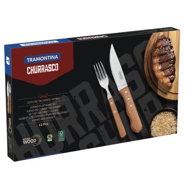 El set Tramontina Dynamic 12 piezas es un juego para asado que reúne 6 cuchillos y 6 tenedores estilo jumbo, diseñado para cenas y encuentros al aire libre. Está elaborado con láminas de acero inoxidable tratado térmicamente, lo que prolonga la durabilidad del filo, y tenedores estampados robustos que aseguran mayor resistencia a deformaciones. Los mangos de madera natural, remachados con aluminio, aportan estética rústica y comodidad al uso.
