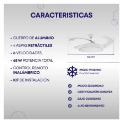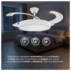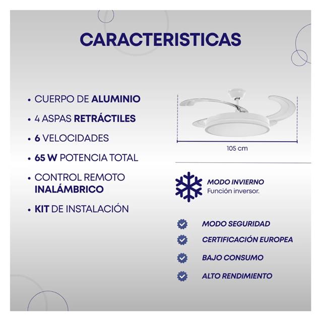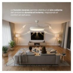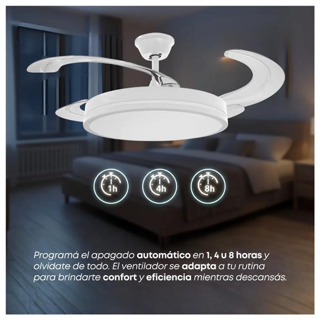 El control remoto facilita su uso, permitiendo encenderlo, apagarlo y ajustar la velocidad desde cualquier lugar de la habitación. Además, cuenta con una lámpara LED integrada, que proporciona una iluminación eficiente y agradable, ideal para complementar la decoración de tu espacio.